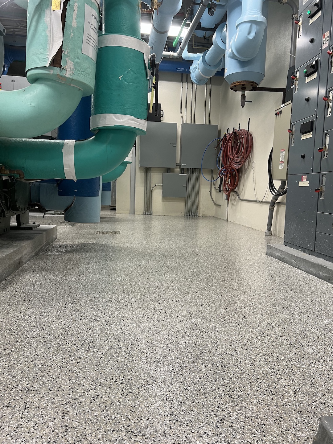 Coating removal and installation of Commercial Flake Flooring across several rooms.